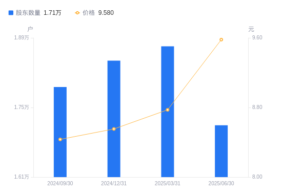 日期A股户数(户)流通A股户均持股数(股)户均持股市值(万元)2025-06-301714323410.0022.432025-03-311873121425.3118.802024-12-311844221761.0218.612024-09-301791322378.5418.872024-06-301799118316.4710.942024-03-312171515069.4313.192023-12-31200025459.856.372023-09-30213805107.926.342023-06-30193425646.137.042023-03-31218134777.147.76